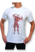 Tシャツの前面と後面で自らの筋肉を自慢しています。